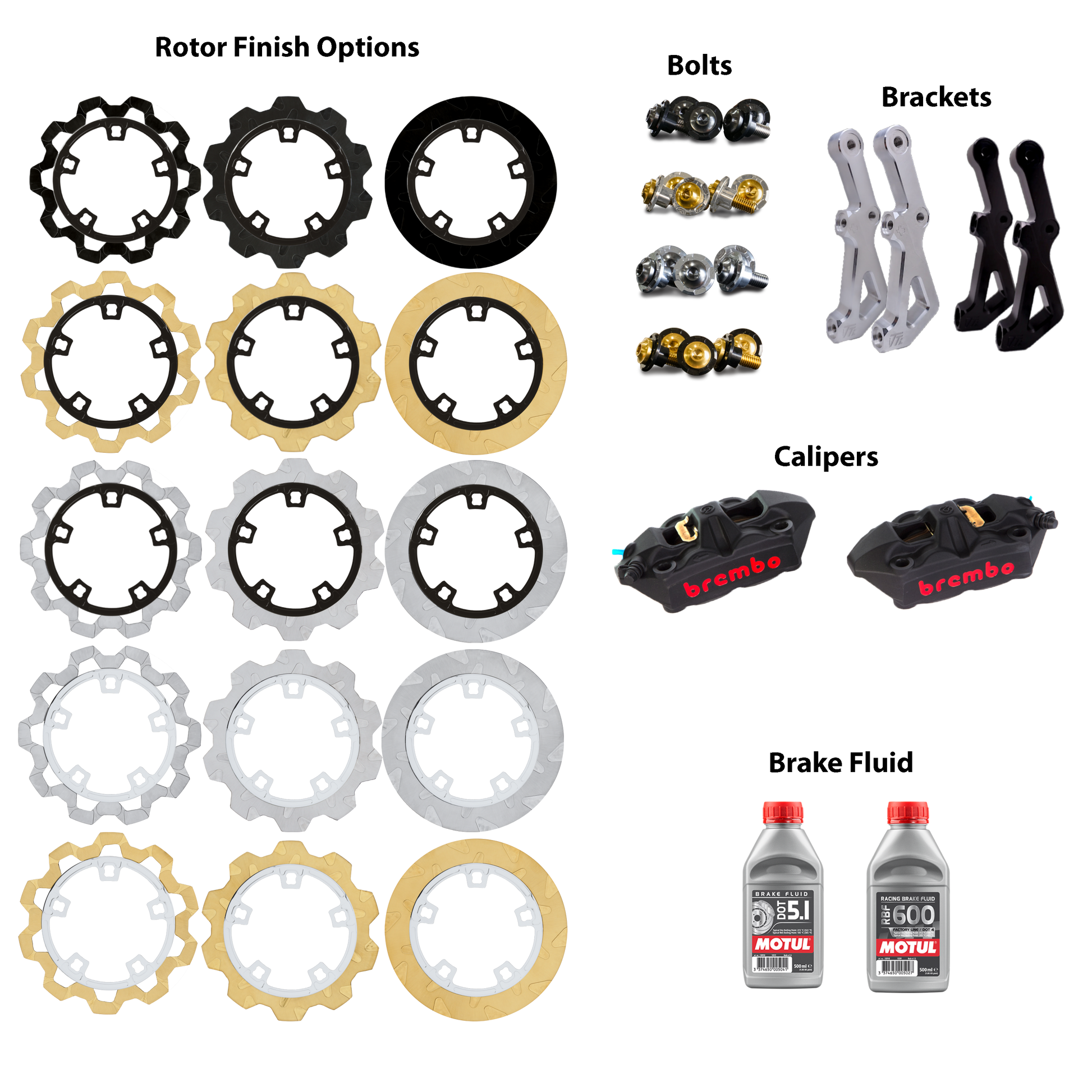 - This kit comes with dual Brembo 108mm radial calipers, caliper brackets, dual Lyndall 13 inch rotors, Lyndall rotor bolt kits, and Motul brake fluid.